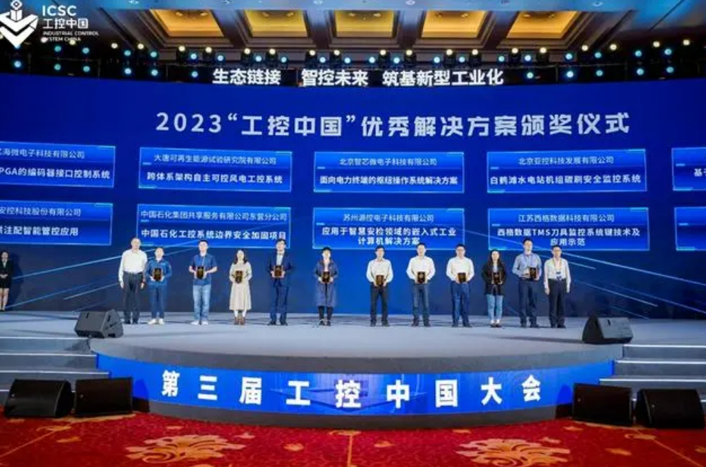 大会现场,2023“工控中国”优秀解决方案颁奖仪式上,中科亿海微电子科技有限公司、大唐可再生能源试验研究院有限公司、北京智芯微电子科技有限公司、北京亚控科技发展有限公司、杭州和利时自动化有限公司、四川安控科技股份有限公司、中国石化集团共享服务有限公司东营分公司、苏州源控电子科技有限公司、江苏西格数据科技有限公司、苏州汇川技术有限公司等10个优秀解决方案进行了发布, 由江苏省政府国有资产监督管理委员会副主任、党委委员李秀斌、哈尔滨工业大学副校长甄良为获选企业授奖。